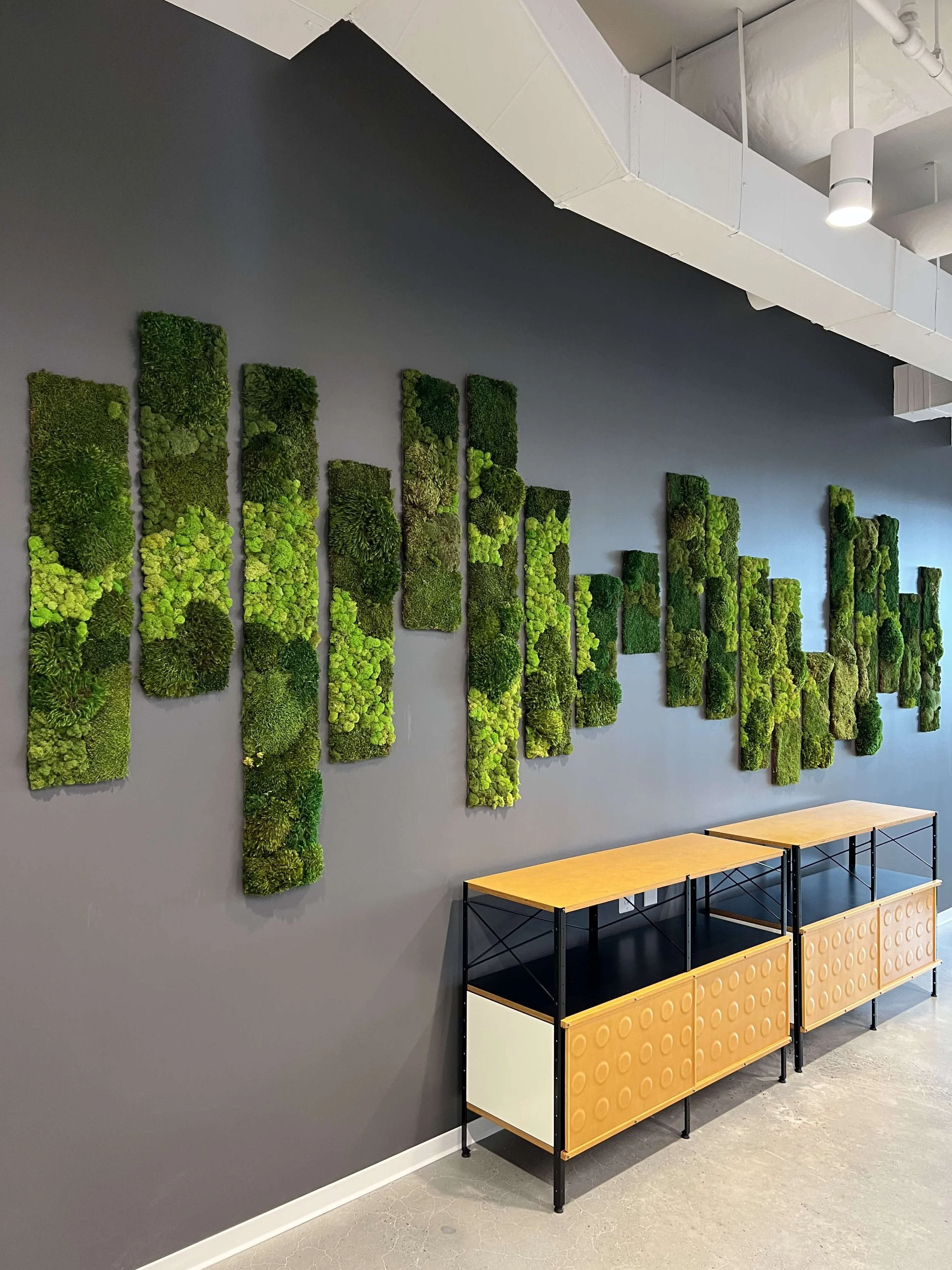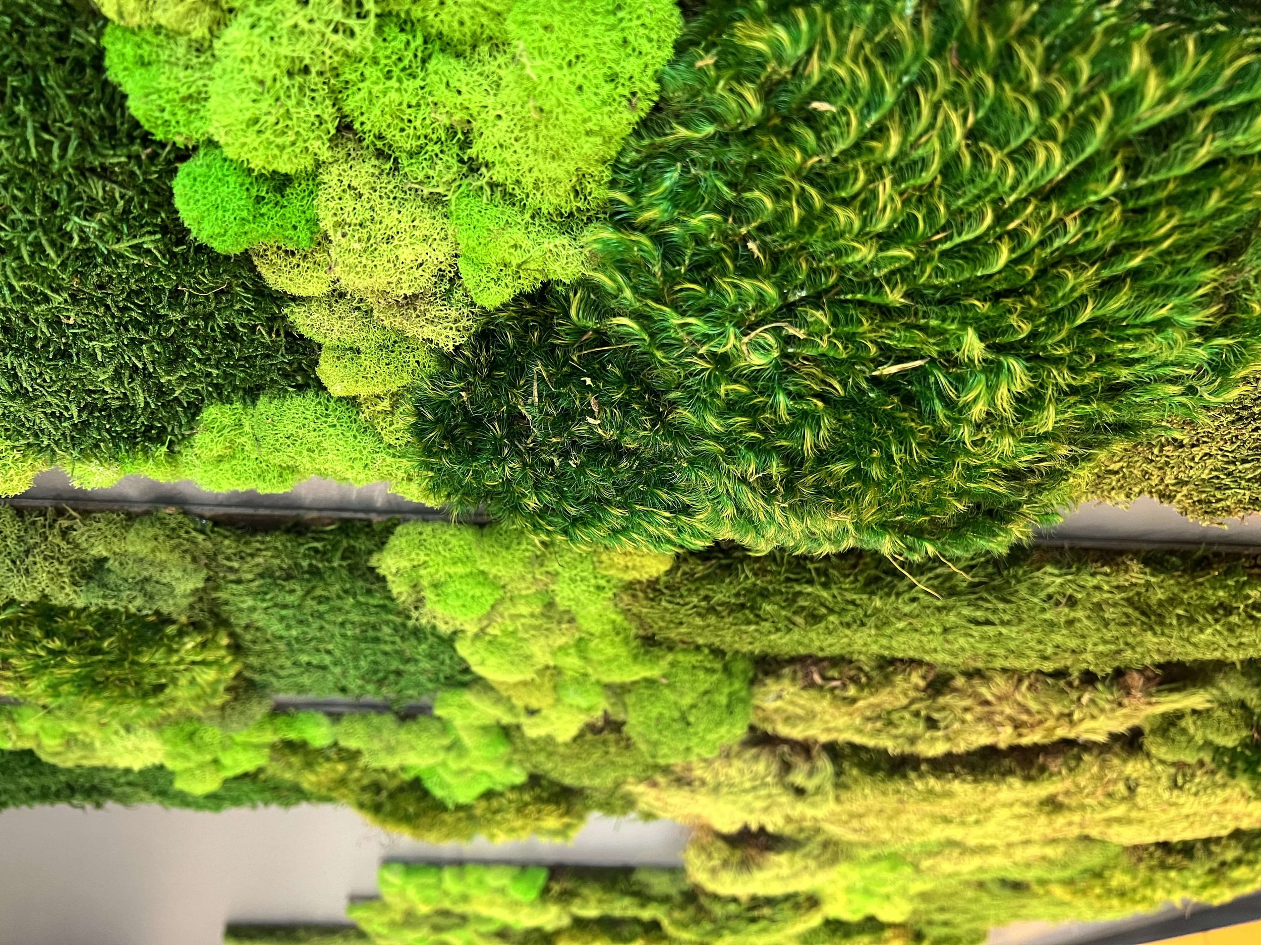 We blended modern graphics with living materials, including moss wall panels, to create a one-of-a-kind branded environment.